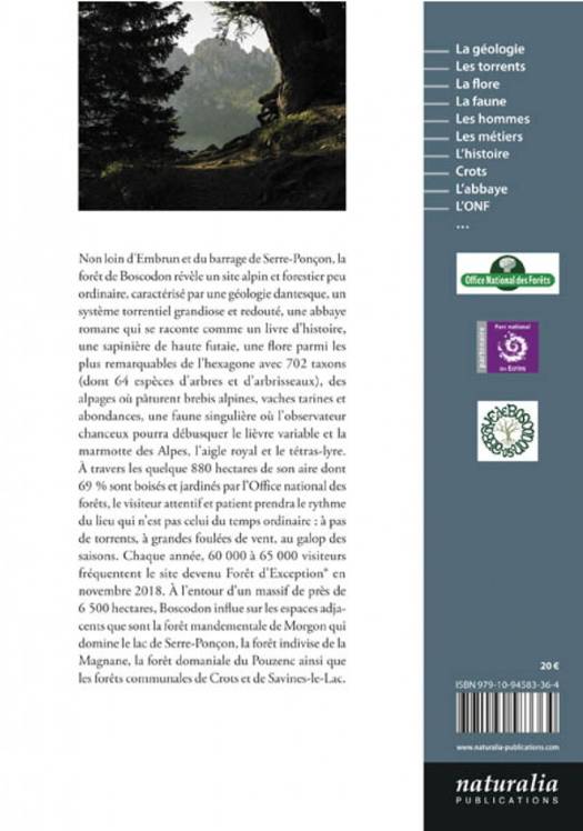 Non loin d'Embrun et du barrage de Serre-Ponçon, la forêt de Boscodon révèle un site alpin et forestier peu ordinaire, caractérisé par une géologie dantesque, un système torrentiel grandiose et redouté, une abbaye romane qui se raconte comme un livre d'histoire, une sapinière de haute futaie, une flore parmi les plus remarquables de l'hexagone avec 702 taxons (dont 64 espèces d'arbres et d'arbrisseaux), des alpages où pâturent brebis alpines, vaches tarines et abondances, une faune singulière où l'observateur chanceux pourra débusquer le lièvre variable et la marmotte des Alpes, l'aigle royal et le tétras-lyre.