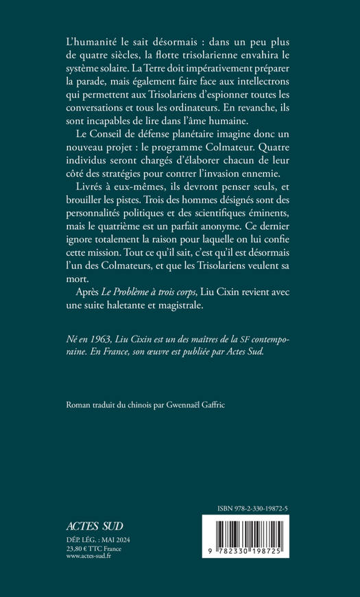 L'humanité sait qu'il lui reste quatre siècles avant que la flotte trisolarienne n'envahisse le système solaire. Les sciences fondamentales se retrouvant verrouillées par les intellectrons, la Terre doit se préparer du mieux qu'elle peut. Le Conseil de Défense Planétaire lance un nouveau projet : le programme « Colmateur », qui consiste à faire appel à quatre individus chargés d'envisager des stratégies secrètes pour contrer l'invasion ennemie. Car s'ils peuvent espionner toutes les conversations et tous les ordinateurs humains grâce aux intellectrons, les Trisolariens sont en revanche incapables de lire dans leurs pensées. Après Le Problème à trois corps, Liu Cixin revient avec une suite magistrale et haletante.