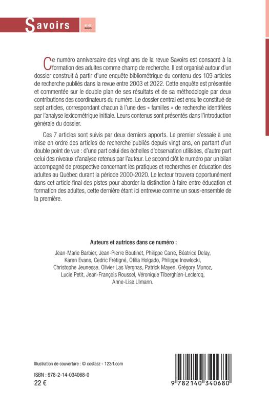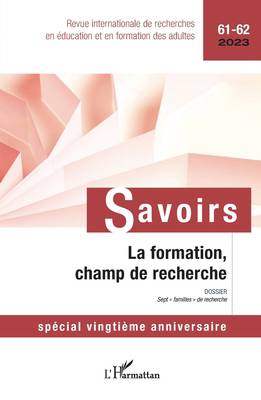 Ce numéro anniversaire des vingt ans de la revue Savoirs est consacré à la formation des adultes comme champ de recherche. Il est organisé autour d'un dossier construit à partir d'une enquête bibliométrique du contenu des 109 articles de recherche publiés dans la revue entre 2003 et 2022. Cette enquête est présentée et commentée sur le double plan de ses résultats et de sa méthodologie par deux contributions des coordinateurs du numéro. Le dossier central est ensuite constitué de sept articles, correspondant chacun à l'une des familles de recherche identifiées par l'analyse lexicométrique initiale. Leurs contenus sont présentés dans l'introduction générale du dossier. Ces 7 articles sont suivis par deux derniers apports. Le premier s'essaie à une mise en ordre des articles de recherche publiés depuis vingt ans, en partant d'un double point de vue: d'une part celui des échelles d'observation utilisées, d'autre part celui des niveaux d'analyse retenus par l'auteur. Le second clôt le numéro par un bilan accompagné de prospective concernant les pratiques et recherches en éducation des adultes au Québec durant la période 2000-2020. Le lecteur trouvera opportunément dans cet article final des pistes pour aborder la distinction à faire entre éducation et formation des adultes, cette dernière étant ici entrevue comme un sous-ensemble de la première.