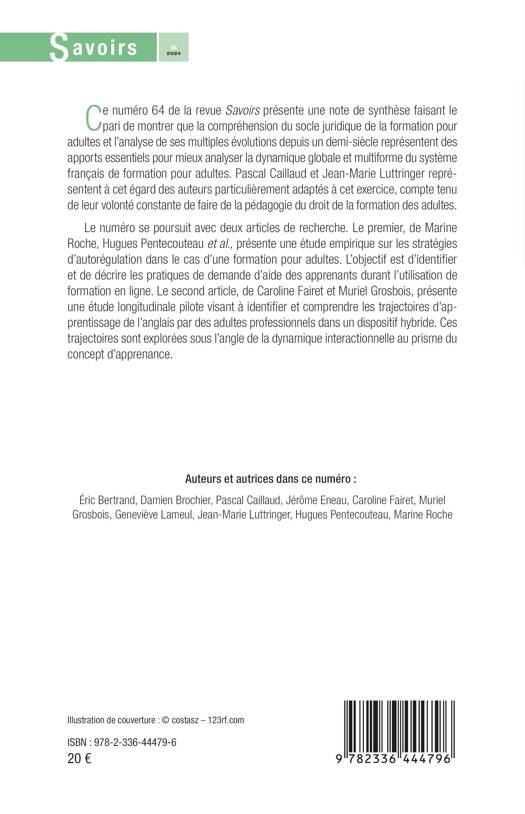 Ce numéro 64 de la revue Savoirs présente une note de synthèse faisant le pari de montrer que la compréhension du socle juridique de la formation pour adultes et l’analyse de ses multiples évolutions depuis un demi-siècle représentent des apports essentiels pour mieux analyser la dynamique globale et multiforme du système français de formation pour adultes. Pascal Caillaud et Jean-Marie Luttringer représentent à cet égard des auteurs particulièrement adaptés à cet exercice, compte tenu de leur volonté constante de faire de la pédagogie du droit de la formation des adultes. Le numéro se poursuit avec deux articles de recherche. Le premier, de Marine Roche, Hugues Pentecouteau et al., présente une étude empirique sur les stratégies d’autorégulation dans le cas d’une formation pour adultes. L’objectif est d’identifier et de décrire les pratiques de demande d’aide des apprenants durant l’utilisation de formation en ligne. Le second article, de Caroline Fairet et Muriel Grosbois, présente une étude longitudinale pilote visant à identifier et comprendre les trajectoires d’apprentissage de l’anglais par des adultes professionnels dans un dispositif hybride. Ces trajectoires sont explorées sous l’angle de la dynamique interactionnelle au prisme du concept d’apprenance.