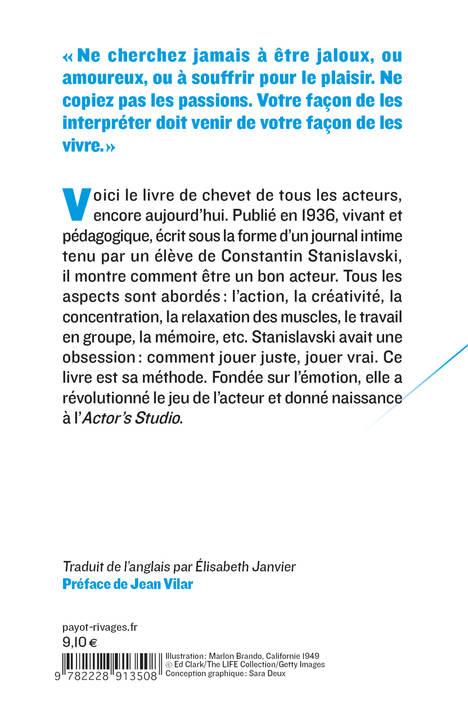 "Ne cherchez jamais à être jaloux, ou amoureux, ou à souffrir pour le plaisir. Ne copiez pas les passions. Votre façon de les interpréter doit venir de votre façon de les vivre." (Constantin Stanislavski) Voici le livre de chevet de tous les acteurs encore aujourd'hui. Publié en 1936, écrit de manière très vivante et pédagogique sous la forme d'un journal intime tenu par un élève de Constantin Stanislavski, il montre comment être un bon acteur. Tous les aspects sont abordés: l'action, la créativité, la concentration, la relaxation des muscles, le travail en groupe, la mémoire, etc. Stanislavski avait une obsession : comment jouer juste, jouer vrai. Ce livre est sa méthode. Fondée sur l'émotion, elle a révolutionné le jeu de l'acteur et donné naissance à l'«Actor's Studio».