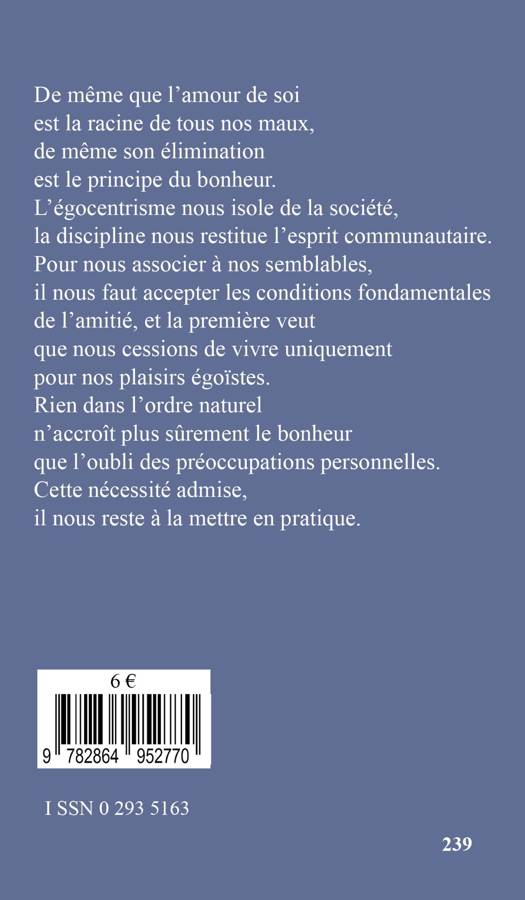 De même que l'amour de soi est la racine de tous nos maux, de même son élimination est le principe du bonheur. L'égocentrisme nous isole de la société, la discipline nous restitue l'esprit communautaire. Pour nous associer à nos semblables, il nous faut accepter les conditions fondamentales de l'amitié, et la première veut que nous cessions de vivre uniquement pour nos plaisirs égoïstes. Rien dans l'ordre naturel n'accroît plus sûrement le bonheur que l'oubli des préoccupations personnelles. Cette nécessité admise, il nous reste à la mettre en pratique.