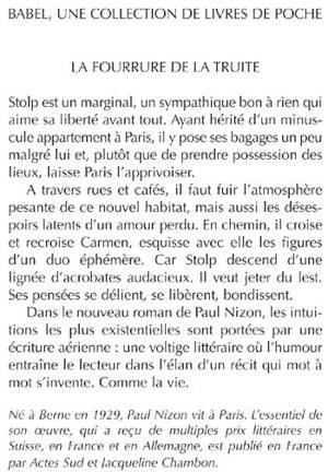 Stolp est un marginal, un sympathique bon à rien qui aime sa liberté avant tout. Ayant hérité d'un minuscule appartement à Paris, il y pose ses bagages un peu malgré lui et, plutôt que de prendre possession des lieux, laisse Paris l'apprivoiser. A travers rues et cafés, il faut fuir l'atmosphère pesante de ce nouvel habitat, mais aussi les désespoirs latents d'un amour perdu. En chemin, il croise et recroise Carmen, esquisse avec elle les figures d'un duo éphémère. Car Stolp descend d'une lignée d'acrobates audacieux. Il veut jeter du lest. Ses pensées se délient, se libèrent, bondissent. Dans le nouveau roman de Paul Nizon, les intuitions les plus existentielles sont portées par une écriture aérienne : une voltige littéraire où l'humour entraîne le lecteur dans l'élan d'un récit qui mot à mot s'invente. Comme la vie. Né à Berne en 1929, Paul Nizon vit à Paris. L'essentiel de son oeuvre, qui a reçu de multiples prix littéraires en Suisse, en France et en Allemagne, est publié en France par Actes Sud et Jacqueline Chambon.