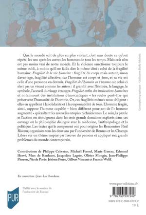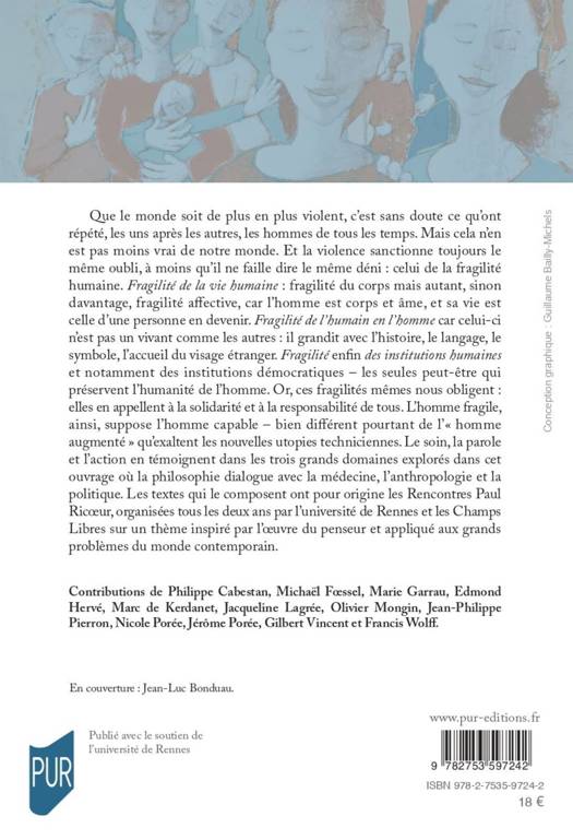 Que le monde soit de plus en plus violent, c’est sans doute ce qu’ont répété, les uns après les autres, les hommes de tous les temps. Mais cela n’en est pas moins vrai de notre monde. Et la violence sanctionne toujours le même oubli, à moins qu’il ne faille dire le même déni: celui de la fragilité humaine. Fragilité de la vie humaine: fragilité du corps mais autant, sinon davantage, fragilité affective, car l’homme est corps et âme, et sa vie est celle d’une personne en devenir. Fragilité de l’humain en l’homme car celui-ci n’est pas un vivant comme les autres: il grandit avec l’histoire, le langage, le symbole, l’accueil du visage étranger. Fragilité en n des institutions humaines et notamment des institutions démocratiques – les seules peut-être qui préservent l’humanité de l’homme. Or, ces fragilités mêmes nous obligent: elles en appellent à la solidarité et à la responsabilité de tous. L’homme fragile, ainsi, suppose l’homme capable – bien différent pourtant de l’«homme augmenté» qu’exaltent les nouvelles utopies techniciennes. Le soin, la parole et l’action en témoignent dans les trois grands domaines explorés dans cet ouvrage où la philosophie dialogue avec la médecine, l’anthropologie et la politique. Les textes qui le composent ont pour origine les Rencontres Paul Ricoeur, organisées tous les deux ans par l’université de Rennes et les Champs Libres sur un thème inspiré par l’oeuvre du penseur et appliqué aux grands problèmes du monde contemporain.