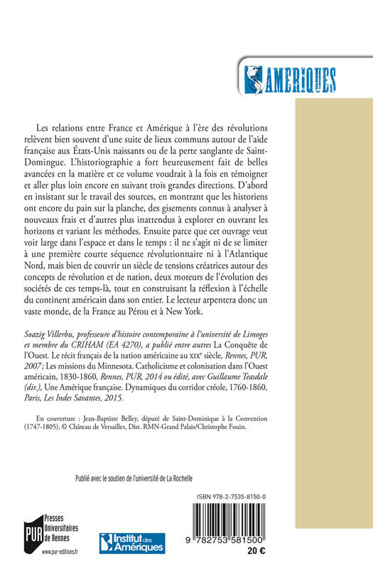 Les relations entre France et Amérique à l’ère des révolutions relèvent bien souvent d’une suite de lieux communs autour de l’aide française aux états-Unis naissants ou de la perte sanglante de Saint-Domingue. L’historiographie a fort heureusement fait de belles avancées en la matière et ce volume voudrait à la fois en témoigner et aller plus loin encore en suivant trois grandes directions. D’abord en insistant sur le travail des sources, en montrant que les historiens ont encore du pain sur la planche, des gisements connus à analyser à nouveaux frais et d’autres plus inattendus à explorer en ouvrant les horizons et variant les méthodes. Ensuite parce que cet ouvrage veut voir large dans l’espace et dans le temps : il ne s’agit ni de se limiter à une première courte séquence révolutionnaire ni à l’Atlantique Nord, mais bien de couvrir un siècle de tensions créatrices autour des concepts de révolution et de nation, deux moteurs de l’évolution des sociétés de ces temps-là, tout en construisant la réflexion à l’échelle du continent américain dans son entier. Le lecteur arpentera donc un vaste monde, de la France au Pérou et à New York.