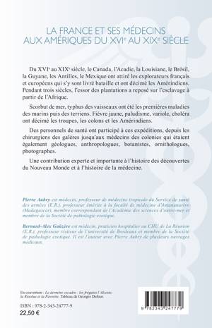Du XVIe au XIXe siècle, le Canada, l’Acadie, la Louisiane, le Brésil, la Guyane, les Antilles, le Mexique ont attiré les explorateurs français et européens qui s’y sont livré bataille et ont décimé les Amérindiens. Scorbut de mer, typhus des vaisseaux ont été les premières maladies des marins puis des terriens. Fièvre jaune, paludisme, variole, choléra ont décimé les troupes, les colons et les Amérindiens. Des personnels de santé ont participé à ces expéditions, depuis les chirurgiens des galères jusqu’aux médecins des colonies. Une contribution experte et importante à l’histoire des découvertes du Nouveau Monde et à l’histoire de la médecine.