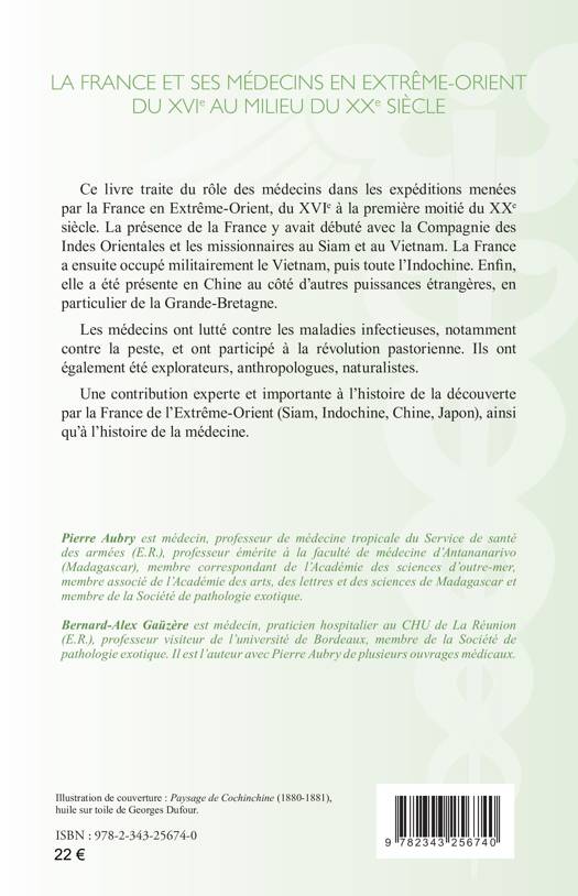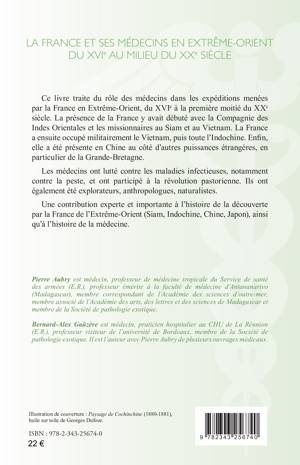 Ce livre traite du rôle des médecins dans les expéditions menées par la France en Extrême-Orient, du XVIe à la première moitié du XXe siècle. La présence de la France y avait débuté avec la Compagnie des Indes Orientales et les missionnaires au Siam et au Vietnam. La France a ensuite occupé militairement le Vietnam, puis toute l’Indochine. Enfin, elle a été présente en Chine au côté d’autres puissances étrangères, en particulier de la Grande-Bretagne. Les médecins ont lutté contre les maladies infectieuses, notamment contre la peste, et ont participé à la révolution pastorienne. Ils ont également été explorateurs, anthropologues, naturalistes.Une contribution experte et importante à l’histoire de la découverte par la France de l’Extrême-Orient (Siam, Indochine, Chine, Japon), ainsi qu’à l’histoire de la médecine.