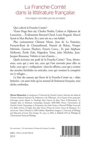 Qui a décrit la Franche-Comté ? Victor Hugo bien sûr, Charles Nodier, Colette et Alphonse de Lamartine... Évidemment Bernard Clavel, Louis Pergaud, Marcel Aymé et Max Buchon. Ils y sont nés ou y ont habité. Plus curieusement Clément Marot, Jean de La Fontaine, François-René de Chateaubriand, Honoré de Balzac, Prosper Mérimée, Gustave Flaubert, Francis Carco... Et puis Stéphane Mallarmé, Émile Zola, Hippolyte Taine, Jules Michelet, Jean- Jacques Rousseau, Voltaire et tant d'autres... Quels écrivains ont parlé de la Franche-Comté ? Tous, dirons- nous, ceux qui y sont nés, ceux qui l'ont traversée pour aller en Italie, ceux qui y trafiquaient dans les affaires, ceux qui y avaient des attaches familiales ou amicales, ceux qui venaient la conquérir ou s'y réfugier... La liste des auteurs qui firent de la Franche-Comté un objet littéraire est aussi riche qu'un manuel de littérature française, tous siècles confondus.
