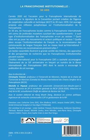 L'année 2020 est l'occasion pour la Francophonie internationale de commémorer la signature de la Convention portant création de l'Agence de coopération culturelle et technique (ACCT) le 20 mars 1970. En 50 ans, les francophonies locales comme la Francophonie internationale ont connu de profondes mutations suscitant des questionnements : à quel type d'insti tutionnalisation des francophonies a-t-on pu assister ? Quels rôles ont pu jouer les mouvements et acteurs politiques et sociaux ? Quelle place occupe l'institutionnalisation du français ou la reconnaissance des communautés de langue française tant au niveau local qu'international ? Quelles formes ces reconnaissances prennent-elles ? Les textes rassemblés illustrent la grande variété des thèmes, des approches et des perspectives de recherche que les francophonies institutionnelles peuvent susciter.
