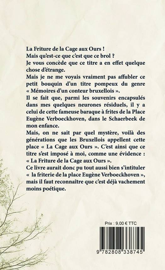 La Friture de la Cage aux Ours ! Mais qu’est-ce que c’est que ce brol ? Je vous concède que ce titre a en effet quelque chose d’étrange. Mais je ne me voyais vraiment pas affubler ce petit bouquin d’un titre pompeux du genre « Mémoires d’un conteur bruxellois ». Il se fait que, parmi les souvenirs encapsulés dans mes quelques neurones résiduels, il y a celui de cette fameuse baraque à frites de la Place Eugène Verboeckhoven, dans le Schaerbeek de mon enfance. Mais, on ne sait par quel mystère, voilà des générations que les Bruxellois appellent cette place « La Cage aux Ours ». C’est ainsi que ce titre s’est imposé à moi, comme une évidence : « La Friture de la Cage aux Ours ». Ce livre aurait donc pu tout aussi bien s’intituler « la friterie de la place Eugène Verboeckhoven », mais il faut reconnaître que c’est déjà vachement moins poétique.