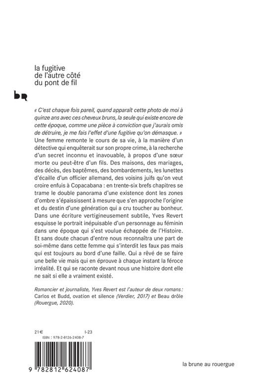 « C'est chaque fois pareil, quand apparaît cette photo de moi à quinze ans avec ces cheveux bruns, la seule qui existe encore de cette époque, comme une pièce à conviction que j'aurais omis de détruire, je me fais l'effet d'une fugitive qu'on démasque. » Une femme remonte le cours de sa vie, à la manière d'un détective qui enquêterait sur son propre crime, à la recherche d'un secret inconnu et inavouable, à propos d'une soeur morte ou peut-être d'un fils. Des maisons, des mariages, des décès, des baptêmes, des bombardements, les lunettes d'écaille d'un officier allemand, des voisins juifs qu'on veut croire enfuis à Copacabana : en trente- six brefs chapitres se trame le double panorama d'une existence dont les zones d'ombre s'épaississent à mesure que s'en approche l'origine et du destin d'une génération qui a cru toucher au bonheur. Dans une écriture vertigineusement subtile, Yves Revert esquisse le portrait inépuisable d'un personnage au féminin dans une époque qui s'est voulue échappée de l'Histoire. Et sans doute chacun d'entre nous reconnaîtra une part de soi-même dans cette femme qui s'interdit les faux pas mais qui est toujours au bord d'une faille. Qui a rêvé de se faire une belle vie mais qui en éprouve à chaque instant la féroce irréalité. Et qui se raconte devant nous une histoire dont elle ne sait si elle a vraiment existé.