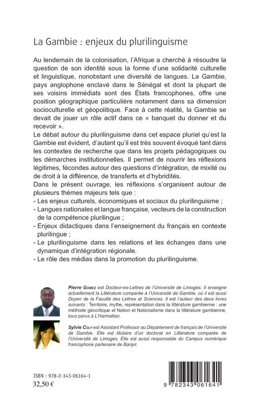 La Gambie, pays anglophone enclavé dans le Sénégal et dont la plupart de ses voisins immédiats sont des Etats francophones, offre une position géographique particulière notamment dans sa dimension socioculturelle et géopolitique. Le débat autour du plurilinguisme dans cet espace pluriel qu'est la Gambie est évident, et permet de nourrir les réflexions légitimes, fécondes autour des questions d'intégration, de mixité ou de droit à la différence, de transferts et d'hybridités.