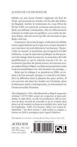 Commence alors une longue confession de Sabiha (nous apprendrons qu'il s'agit d'un roman destiné à un concours) où sont dénoncés l'archaïsme, l'hypocrisie, la cruauté, le machisme qui ravagent la société irakienne, et que la répression politique ne fait qu'ancrer davantage dans les moeurs. La narratrice dévoile parallèlement ce qui la rattache encore à la vie : sa recherche éperdue du plaisir sexuel, ses amours avec ses amies Hoda et Hijran, ses liaisons passionnées mais toujours insatisfaites avec des hommes de passage...