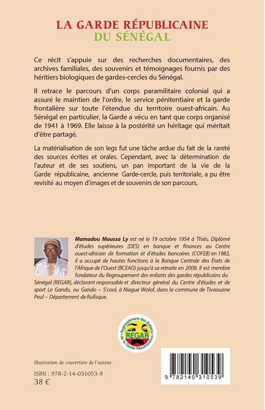 Ce récit s'appuie sur des recherches documentaires, des archives familiales, des souvenirs et témoignages fournis par des héritiers biologiques de gardes-cercles du Sénégal. Il retrace le parcours d'un corps paramilitaire colonial qui a assuré le maintien de l'ordre, le service pénitentiaire et la garde frontalière sur toute l'étendue du territoire ouest-africain. Au Sénégal en particulier, la Garde a vécu en tant que corps organisé de 1941 à 1969. Elle laisse à la postérité un héritage qui méritait d'être partagé. La matérialisation de son legs fut une tâche ardue du fait de la rareté des sources écrites et orales. Cependant, avec la détermination de l'auteur et de ses soutiens, un pan important de la vie de la Garde républicaine, ancienne Garde-cercle, puis territoriale, a pu être revisité au moyen d'images et de souvenirs de son parcours.