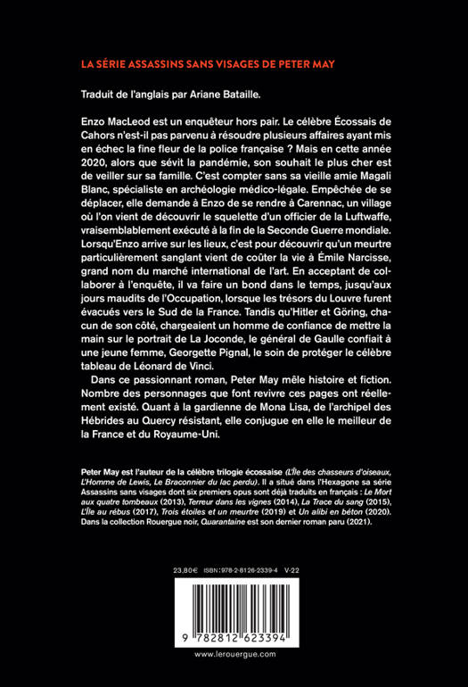 Enzo MacLeod est un enquêteur hors pair. Le célèbre Écossais de Cahors n'est-il pas parvenu à résoudre plusieurs affaires ayant mis en échec la fine fleur de la police française ? Mais en cette année 2020, alors que sévit la pandémie, son souhait le plus cher est de veiller sur sa famille. C'est compter sans sa vieille amie Magali Blanc, spécialiste en archéologie médico-légale. Empêchée de se déplacer, elle demande à Enzo de se rendre à Carennac, un village où l'on vient de découvrir le squelette d'un officier de la Luftwaffe, vraisemblablement exécuté à la fin de la Seconde Guerre mondiale. Lorsqu'Enzo arrive sur les lieux, c'est pour découvrir qu'un meurtre particulièrement sanglant vient de coûter la vie à Émile Narcisse, grand nom du marché international de l'art. En acceptant de collaborer à l'enquête, il va faire un bond dans le temps, jusqu'aux jours maudits de l'Occupation, lorsque les trésors du Louvre furent évacués vers le Sud de la France. Tandis qu'Hitler et Göring, chacun de son côté, chargeaient un homme de confiance de mettre la main sur le portrait de La Joconde, le général de Gaulle confiait à une jeune femme, Georgette Pignal, le soin de protéger le célèbre tableau de Léonard de Vinci. Dans ce passionnant roman, Peter May mêle histoire et fiction. Nombre des personnages que font revivre ces pages ont réellement existé. Quant à la gardienne de Mona Lisa, de l'archipel des Hébrides au Quercy résistant, elle conjugue en elle le meilleur de la France et du Royaume-Uni.