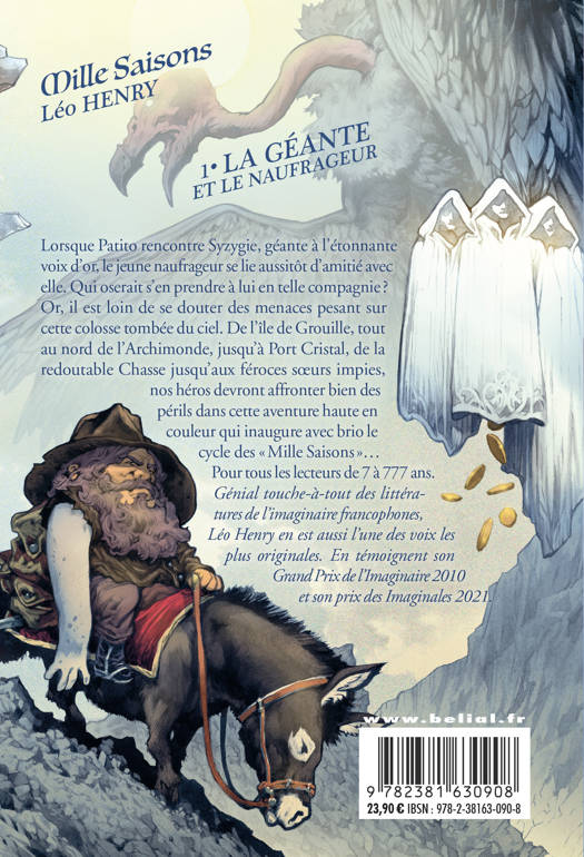 Lorsque Patito rencontre Syzygie, géante à l'étonnante voix d'or, le jeune naufrageur se lie aussitôt d'amitié avec elle. Qui oserait s'en prendre à lui en telle compagnie ? Or, il est loin de se douter des menaces pesant sur cette colosse tombée du ciel. De l'île de Grouille, tout au nord de l'Archimonde, jusqu'à Port Cristal, de la redoutable Chasse jusqu'aux féroces soeurs impies, nos héros devront affronter bien des périls dans cette aventure haute en couleur qui inaugure avec brio le cycle des « Mille Saisons »...