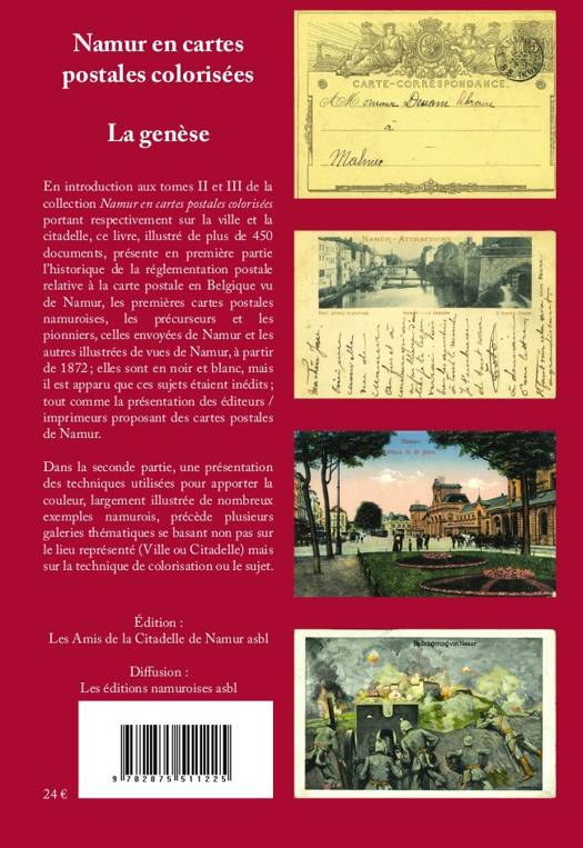 De nombreux livres présentent Namur au travers des cartes postales anciennes. Cette nouvelle collection (Namur en cartes postales colorisée) propose une toute nouvelle approche via ce type particulier de support qu’est la carte postale colorisée. Dans le tome I, illustré de près de 450 documents, les auteurs fixent les bases en abordant l’histoire postale de la carte-vue en Belgique vue de Namur avec les premières cartes postales namuroises, les précurseurs et les pionniers, celles envoyées de Namur et les autres illustrées de vues de Namur, à partir de 1872 ; elles sont en noir et blanc, mais il est apparu que ces sujets étaient inédits ; tout comme la présentation des éditeurs / imprimeurs proposant des cartes postales de Namur. Dans la seconde partie, une présentation des techniques utilisées pour apporter la couleur, largement illustrée de nombreux exemples namurois, précède plusieurs galeries thématiques de cartes colorisées se basant sur la technique de colorisation ou le sujet.