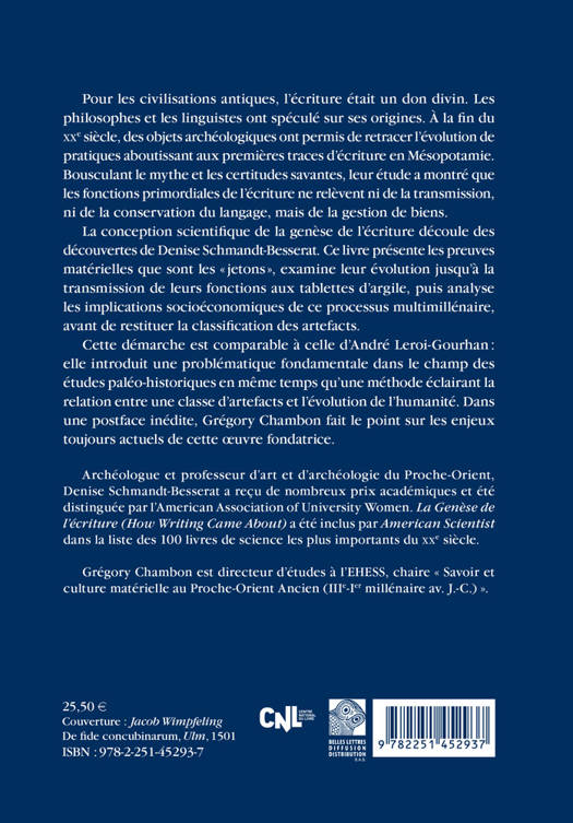 Pour les civilisations antiques, l'ecriture etait un don divin. Les philosophes et les linguistes ont specule sur ses origines. A la fin du XXe siecle, des objets archeologiques ont permis de retracer l'evolution de pratiques aboutissant aux premieres traces d'ecriture en Mesopotamie. Bousculant le mythe et les certitudes savantes, leur etude a montre que les fonctions primordiales de l'ecriture ne relevent ni de la transmission, ni de la conservation du langage, mais de la gestion de biens. La conception scientifique de la genese de l'ecriture decoule des decouvertes de Denise Schmandt-Besserat. Ce livre presente les preuves materielles que sont les jetons , examine leur evolution jusqu'a la transmission de leurs fonctions aux tablettes d'argile, puis analyse les implications socioeconomiques de ce processus multimillenaire, avant de restituer la classification des artefacts. Cette demarche est comparable a celle d'Andre Leroi-Gourhan: elle introduit une problematique fondamentale dans le champ des etudes paleo-historiques en meme temps qu'une methode eclairant la relation entre une classe d'artefacts et l'evolution de l'humanite. Dans une postface inedite, Gregory Chambon fait le point sur les enjeux toujours actuels de cette oeuvre fondatrice.