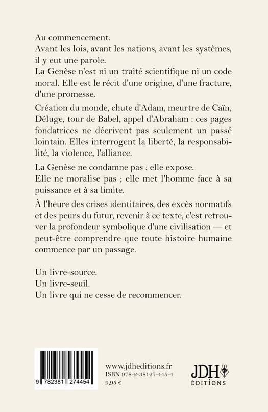 Au commencement. Avant les lois, avant les nations, avant les systèmes politiques et les constructions idéologiques, il y eut une parole. Une parole qui sépare la lumière des ténèbres, qui ordonne le chaos, qui donne un nom aux choses et place l'homme face à sa responsabilité. La Genèse, premier livre de la Bible et texte fondateur de l'Ancien Testament, n'est ni un traité scientifique sur la création du monde ni un code moral figé. Elle est une cosmogonie, une anthropologie, une méditation sur l'origine et sur la liberté. Création d'Adam et Ève, chute et connaissance du bien et du mal, meurtre de Caïn et d'Abel, civilisation antédiluvienne, Déluge et arche de Noé, tour de Babel, appel d'Abraham : chaque récit pose une question fondamentale sur la condition humaine.Ces pages inaugurales ne cherchent pas à enfermer l'homme dans la culpabilité, mais à le confronter à sa puissance et à sa limite. La chute n'est pas une simple faute, mais l'entrée dans une histoire. Le Déluge n'est pas une destruction absolue, mais une réorientation. L'alliance n'est pas une domination, mais une promesse. La Genèse ne moralise pas ; elle révèle. Elle n'impose pas une lecture unique ; elle ouvre un espace d'interprétation. À travers ses symboles, elle traverse les siècles et continue d'éclairer les grandes interrogations spirituelles : la liberté, la responsabilité, la violence, la transmission, la foi, le passage. À l'approche de Pâques et de Pessah, temps de renouveau et de mémoire, revenir à la Genèse, c'est redécouvrir la profondeur d'un texte qui structure encore notre imaginaire collectif. Ce livre n'appartient pas seulement au passé ; il interroge notre présent et notre avenir. Un texte fondateur. Un livre-source. Un seuil spirituel qui ne cesse de recommencer.