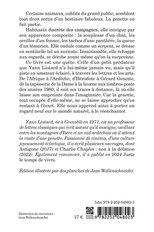 Certains animaux, oublies du grand public, semblent tout droit sortis d'un bestiaire fabuleux. La genette en fait partie. Habitante discrete des campagnes, elle intrigue par son apparence composite: la souplesse d'un chat, les oreilles d'un fennec, les taches d'une panthere, la queue d'un lemurien. Elle ondule comme un serpent, se dresse en sentinelle tel un suricate. Insaisissable, elle echappe aux regards, se derobe avant meme qu'on la surprenne. Ce livre est une quete. Celle d'un petit predateur que Yann Liotard n'a lui-meme jamais vu, mais qu'il piste en amateur eclaire, a travers les lettres et les arts. De l'Afrique a l'Ardeche, d'Herodote a Gerard Genette, de la tapisserie de la Dame a la licorne aux timbres-poste des annees 1980, il suit ses traces a distance, la ou elle laisse son empreinte dans l'imaginaire. Car la genette, tout occupee d'elle-meme, ne se laisse approcher qu'en restant a l'ecart. Elle nous apprend ainsi a porter un regard neuf sur le monde naturel, a le reenchanter. Edition illustree par des planches de Jean Wollenschneider.