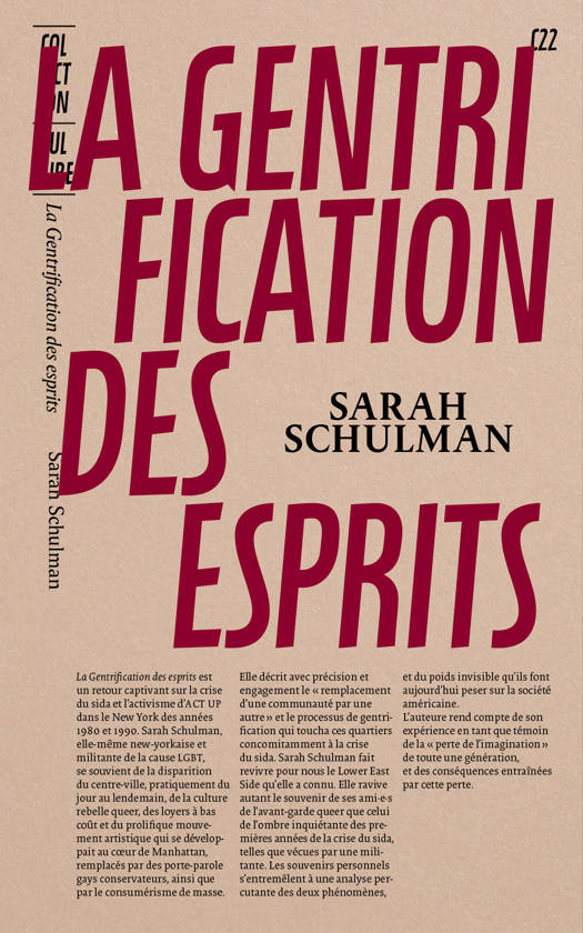 La Gentrification des esprits est un retour captivant sur la crise du sida et l’activisme d’ACT UP dans le New York des années 1980 et 1990. Sarah Schulman, elle-même new-yorkaise et militante de la cause LGBTQIA+, se souvient de la disparition du centre-ville, pratiquement du jour au lendemain, de la culture rebelle queer, des loyers à bas coût et du prolifique mouvement artistique qui se développait au cœur de Manhattan, remplacés par des porte-parole gays conservateurs, ainsi que par le consumérisme de masse. Elle décrit avec précision et engagement le « remplacement d’une communauté par une autre » et le processus de gentrification qui toucha ces quartiers concomitamment à la crise du sida. Sarah Schulman fait revivre pour nous le Lower East Side qu’elle a connu. Elle ravive autant le souvenir de ses ami·es de l’avant-garde queer que celui de l’ombre inquiétante des premières années de la crise du sida, telles que vécues par une militante. Les souvenirs personnels s’entremêlent à une analyse percutante des deux phénomènes, et du poids invisible qu’ils font aujourd’hui peser sur la société étatsunienne. L’autrice rend compte de son expérience en tant que témoin de la « perte de l’imagination » de toute une génération, et des conséquences entraînées par cette dernière.