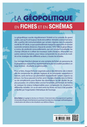 Cet ouvrage cherche à dresser en une centaine de fiches un panorama de la géopolitique aujourd’hui, représentatif et le plus accessible possible à un large lectorat – étudiants ou grand public. Pour ce faire, chaque fiche est organisée autour des éléments-clés à retenir afin de comprendre les grandes logiques et les principales oppositions à l’œuvre, suivie de focus qui permettent d’approfondir certains aspects ou acteurs. Ces focus peuvent à la fois servir d’angles d’entrée dans le thème ou de compléments pour illustrer des dissertations ou des études de cas plus poussées. Chaque fiche se conclut par un schéma-bilan, qui permet de mettre en exergue les enjeux indispensables pour comprendre les situations, à différentes échelles. Un va-et-vient entre les fiches est tout à fait possible et facilité par l’organisation thématique de l’ouvrage.
