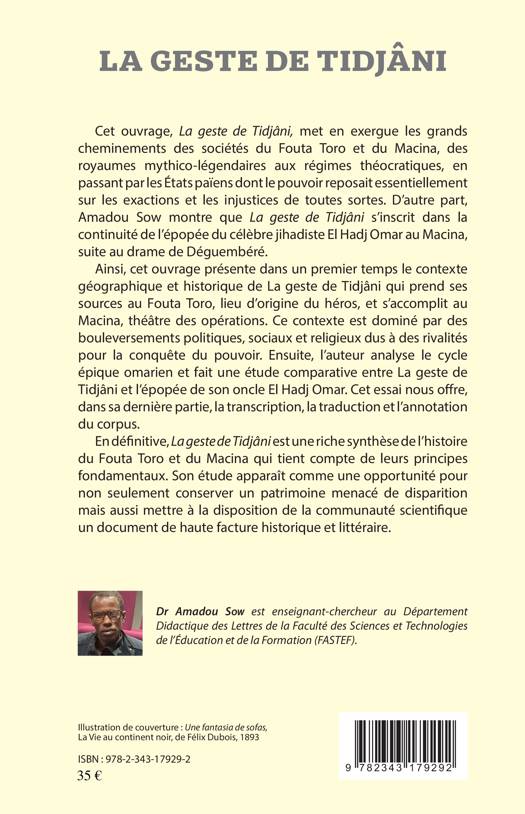Cet ouvrage met en exergue les grands cheminements des sociétés du Fouta Toro et du Macina, des royaumes mythico-légendaires aux régimes théocratiques, en passant par les États païens dont le pouvoir reposait essentiellement sur les exactions et les injustices de toutes sortes. D'autre part, Amadou Sow montre que La geste de Tidjâni s'inscrit dans la continuité de l'épopée du célèbre jihadiste El Hadj Omar au Macina, suite au drame de Déguembéré.