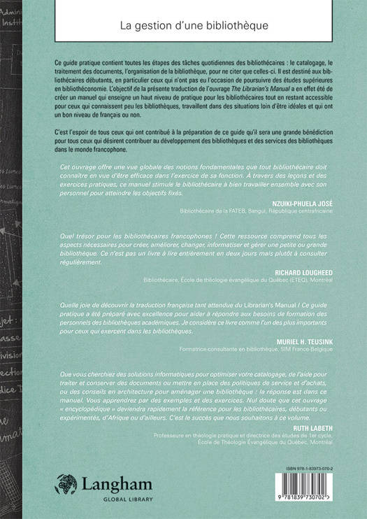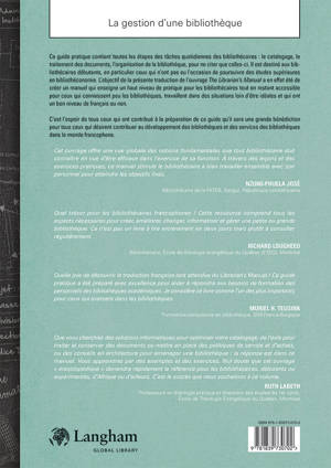 Ce guide pratique contient toutes les étapes des tâches quotidiennes des bibliothécaires: le catalogage, le traitement des documents, l'organisation de la bibliothèque, pour ne citer que celles-ci. Il est destiné aux bibliothécaires débutants, en particulier ceux qui n'ont pas eu l'occasion de poursuivre des études supérieures en bibliothéconomie. L'objectif de la présente traduction de l'ouvrage The Librarian's Manual a en effet été de créer un manuel qui enseigne un haut niveau de pratique pour les bibliothécaires tout en restant accessible pour ceux qui connaissent peu les bibliothèques, travaillent dans des situations loin d'être idéales et qui ont un bon niveau de français ou non.