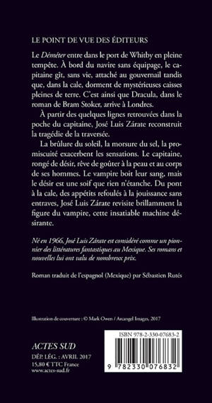 Le «Déméter» entre dans le port de Whitby en pleine tempête. À bord du navire sans équipage, le capitaine gît, sans vie, attaché au gouvernail tandis que, dans la cale, dorment de mystérieuses caisses pleines de terre. C'est ainsi que Dracula, dans le roman de Bram Stoker, arrive à Londres. À partir des quelques lignes retrouvées dans la poche du capitaine, José Luis Zárate reconstruit la tragédie de la traversée. La brûlure du soleil, la morsure du sel, la promiscuité exacerbent les sensations. Le capitaine, rongé de désir, rêve de goûter à la peau et au corps de ses hommes. Le vampire boit leur sang, mais le désir est une soif que rien n'étanche. Du pont à la cale, des appétits refoulés à la jouissance sans entraves, José Luis Zárate revisite brillamment la figure du vampire, cette insatiable machine désirante.