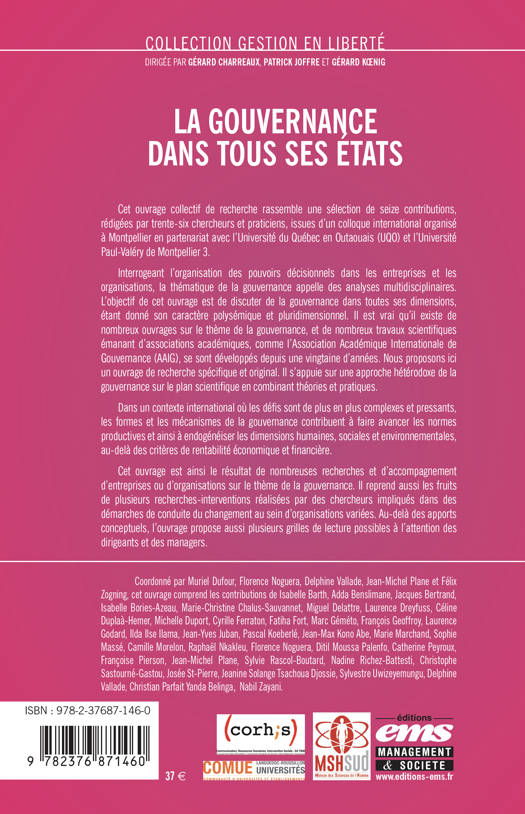 Cet ouvrage collectif de recherche rassemble une sélection de seize contributions, rédigées par trente-six chercheurs et praticiens, issues d'un colloque international organisé à Montpellier en partenariat avec l'Université du Québec en Outaouais (UQO) et l'Université Paul-Valéry de Montpellier 3. Interrogeant l'organisation des pouvoirs décisionnels dans les entreprises et les organisations, la thématique de la gouvernance appelle des analyses multidisciplinaires. L'objectif de cet ouvrage est de discuter de la gouvernance dans toutes ses dimensions, étant donné son caractère polysémique et pluridimensionnel. Il est vrai qu'il existe de nombreux ouvrages sur le thème de la gouvernance, et de nombreux travaux scientifiques émanant d'associations académiques, comme l'Association Académique Internationale de Gouvernance (AAIG), se sont développés depuis une vingtaine d'années. Nous proposons ici un ouvrage de recherche spécifique et original. Il s'appuie sur une approche hétérodoxe de la gouvernance sur le plan scientifique en combinant théories et pratiques. Dans un contexte international où les défis sont de plus en plus complexes et pressants, les formes et les mécanismes de la gouvernance contribuent à faire avancer les normes productives et ainsi à endogénéiser les dimensions humaines, sociales et environnementales, au-delà des critères de rentabilité économique et financière. Cet ouvrage est ainsi le résultat de nombreuses recherches et d'accompagnement d'entreprises ou d'organisations sur le thème de la gouvernance. Il reprend aussi les fruits de plusieurs recherches-interventions réalisées par des chercheurs impliqués dans des démarches de conduite du changement au sein d'organisations variées. Au-delà des apports conceptuels, l'ouvrage propose aussi plusieurs grilles de lecture possibles à l'attention des dirigeants et des managers.