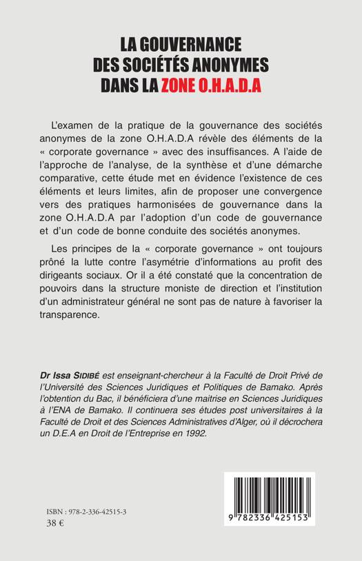 L'examen de la pratique de la gouvernance des sociétés anonymes de la zone O.H.A.D.A révèle des éléments de la corporate governance avec des insuffisances. A l'aide de l'approche de l'analyse, de la synthèse et d'une démarche comparative, cette étude met en évidence l'existence de ces éléments et leurs limites, afin de proposer une convergence vers des pratiques harmonisées de gouvernance dans la zone O.HA.D.A par l'adoption d'un code de gouvernance et d'un code de bonne conduite des sociétés anonymes. Les principes de la corporate governance ont toujours prôné la lutte contre l'asymétrie d'informations au profit des dirigeants sociaux. Or il a été constaté que la concentration de pouvoirs dans la structure moniste de direction et l'institution d'un administrateur général ne sont pas de nature à favoriser la transparence.