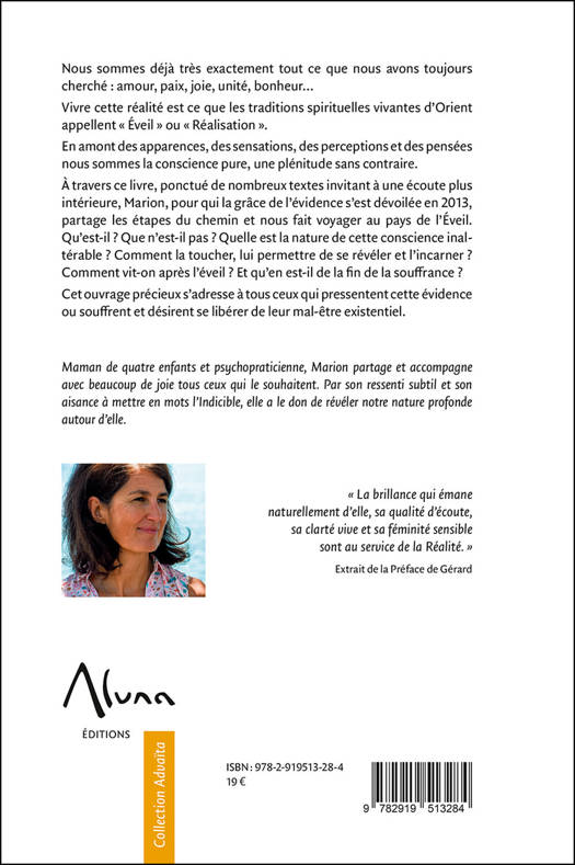Nous sommes déjà très exactement tout ce que nous avons toujours cherché : amour, paix, joie, unité, bonheur… Vivre cette réalité est ce que les traditions spirituelles vivantes d’Orient appellent « Éveil » ou « Réalisation ». En amont des apparences, des sensations, des perceptions et des pensées nous sommes la conscience pure, une plénitude sans contraire. À travers ce livre, ponctué de nombreux textes invitant à une écoute plus intérieure, Marion, pour qui la grâce de l’évidence s’est dévoilée en 2013, partage les étapes du chemin et nous fait voyager au pays de l’Éveil. Qu’est-il ? Que n’est-il pas ? Quelle est la nature de cette conscience inaltérable ? Comment la toucher, lui permettre de se révéler et l’incarner ? Comment vit-on après l’éveil ? Et qu’en est-il de la fin de la souffrance ? Cet ouvrage précieux s’adresse à tous ceux qui pressentent cette évidence ou souffrent et désirent se libérer de leur mal-être existentiel.