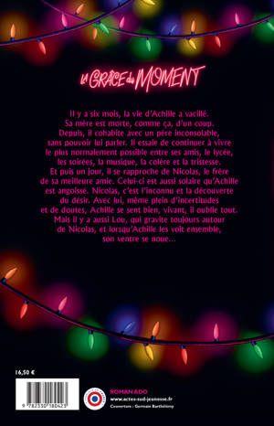 Il y a six mois, la vie d'Achille a vacillé. Sa mère est morte, comme ça, d'un coup. Depuis, il cohabite avec un père inconsolable, sans pouvoir lui parler. Il essaie de continuer à vivre le plus normalement possible entre ses amis, le lycée, les soirées, la musique, la colère et la tristesse. Et puis un jour, il se rapproche de Nicolas, le frère de sa meilleure amie. Celui-ci est aussi solaire qu'Achille est angoissé. Nicolas, c'est l'inconnu et la découverte du désir. Avec lui, même plein d'incertitudes et de doutes, Achille se sent bien, vivant, il oublie tout. Mais il y a aussi Lou, qui gravite toujours autour de Nicolas, et lorsqu'Achille les voit ensemble, son ventre se noue...