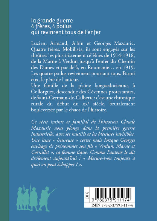 Lucien, Armand, Albin et Georges Mazauric. Quatre frères. Mobilisés, ils sont engagés sur les théâtres les plus tristement célèbres de 1914-1918, de la Marne à Verdun jusqu’à l’enfer du Chemin des Dames et par-delà, en Roumanie… en 1919. Les quatre poilus reviennent pourtant tous. Parmi eux, le père de l’auteur. Une famille de la plaine languedocienne, à Collorgues, descendue des Cévennes protestantes, de Saint-Germain-de-Calberte : c’est une chronique rurale du début du XXe siècle, brutalement bouleversée par le chaos de l’histoire.
