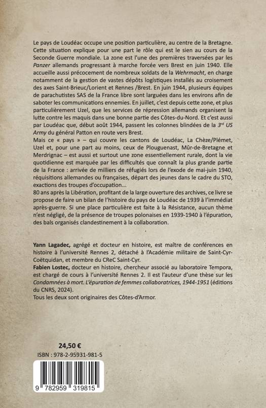 Le pays de Loudéac occupe une position particulière, au centre de la Bretagne. Cette situation explique pour une part le rôle qui est le sien au cours de la Seconde Guerre mondiale. La zone est l’une des premières traversées par les Panzer allemands progressant à marche forcée vers Brest en juin 1940. Elle accueille aussi précocement de nombreux soldats de la Wehrmacht, en charge notamment de la gestion de vastes dépôts logistiques installés au croisement des axes Saint-Brieuc/Lorient et Rennes /Brest. En juin 1944, plusieurs équipes de parachutistes SAS de la France libre sont larguées dans les environs afin de saboter les communications ennemies. En juillet, c’est depuis cette zone, et plus particulièrement Uzel, que les services de répression allemands organisent la lutte contre les maquis dans une bonne partie des Côtes-du-Nord. Et c’est aussi par Loudéac que, début août 1944, passent les colonnes blindées de la 3rd US Army du général Patton en route vers Brest. Mais ce « pays » – qui couvre les cantons de Loudéac, La Chèze/Plémet, Uzel et, pour une part au moins, ceux de Plouguenast, Mûr-de-Bretagne et Merdrignac – est aussi et surtout une zone essentiellement rurale, dont la vie quotidienne est marquée par les difficultés que connaît la plus grande partie de la France : arrivée de milliers de réfugiés lors de l’exode de mai-juin 1940, réquisitions allemandes ou françaises, départ des jeunes dans le cadre du STO, exactions des troupes d’occupation... 80 ans après la Libération, profitant de la large ouverture des archives, ce livre se propose de faire un bilan de l’histoire du pays de Loudéac de 1939 à l’immédiat après-guerre. Si une place particulière est faite à la Résistance, aucun thème n’est négligé, de la présence de troupes polonaises en 1939-1940 à l’épuration, des bals organisés clandestinement à la collaboration.