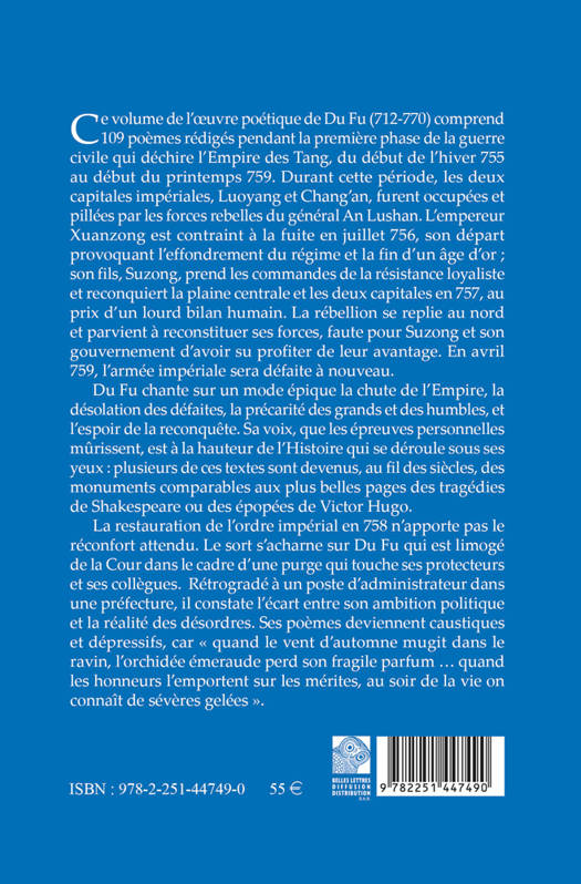 Ce volume de l'oeuvre poetique de Du Fu (712-770) comprend 109 poemes rediges pendant la premiere phase de la guerre civile qui dechire l'Empire des Tang, du debut de l'hiver 755 au debut du printemps 759. Durant cette periode, les deux capitales imperiales, Luoyang et Chang'an, furent occupees et pillees par les forces rebelles du general An Lushan. L'empereur Xuanzong est contraint a la fuite en juillet 756, son depart provoquant l'effondrement du regime et la fin d'un age d'or; son fils, Suzong, prend les commandes de la resistance loyaliste et reconquiert la plaine centrale et les deux capitales en 757, au prix d'un lourd bilan humain. La rebellion se replie au nord et parvient a reconstituer ses forces, faute pour Suzong et son gouvernement d'avoir su profiter de leur avantage. En avril 759, l'armee imperiale sera defaite a nouveau. Du Fu chante sur un mode epique la chute de l'Empire, la desolation des defaites, la precarite des grands et des humbles, et l'espoir de la reconquete. Sa voix, que les epreuves personnelles murissent, est a la hauteur de l'Histoire qui se deroule sous ses yeux: plusieurs de ces textes sont devenus, au fil des siecles, des monuments comparables aux plus belles pages des tragedies de Shakespeare ou des epopees de Victor Hugo. La restauration de l'ordre imperial en 758 n'apporte pas le reconfort attendu. Le sort s'acharne sur Du Fu qui est limoge de la Cour dans le cadre d'une purge qui touche ses protecteurs et ses collegues. Retrograde a un poste d'administrateur dans une prefecture, il constate l'ecart entre son ambition politique et la realite des desordres. Ses poemes deviennent caustiques et depressifs, car quand le vent d'automne mugit dans le ravin, l'orchidee emeraude perd son fragile parfum ... quand les honneurs l'emportent sur les merites, au soir de la vie on connait de severes gelees .