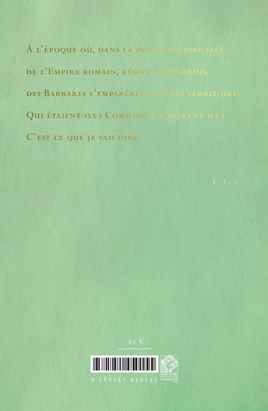 A l'epoque ou, dans la partie occidentale de l'Empire romain, regnait Honorius, des Barbares s'emparerent de son territoire. Qui etaient-ils ? Comment s'y prirent-ils ? C'est ce que je vais dire. I, 2, 1 Pour retrouver tous les volumes de la serie,