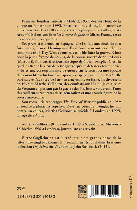 Premiers bombardements a Madrid, 1937, derniers feux de la guerre au Panama en 1990. Entre ces deux dates, la journaliste americaine Martha Gellhorn a couvert les plus grands conflits, recits rassembles dans son livre La Guerre de face, inedit en France, texte cheri des grands reporters.Ses premieres armes en Espagne, elle les fait aux cotes de son futur mari, Ernest Hemingway. Ils se sont rencontres quelques mois plus tot a Key West et ont aussitot file faire la guerre. Choc pour la jeune femme de 28 ans, de la bonne societe de Saint-Louis (Missouri), a la carriere journalistique deja bien remplie. C'est la qu'elle attrape le virus de cette guerre qu'elle detestera toute sa vie. Tu es une correspondante de guerre sur le front ou une epouse dans mon lit? lui lance Papa , exaspere, quand, en 1943, elle part suivre l'avancee de l'armee americaine en Italie. Ils divorcent en 1945 et Martha Gellhorn, des combats sur l'ile de Java a ceux du Vietnam en passant par la guerre des Six Jours, va devenir l'une des meilleures reporters de sa generation et une grande figure de la presse americaine.Son recueil de reportages The Face of War est publie en 1959 et reedite a plusieurs reprises. Devenue presque aveugle, luttant contre un cancer, Martha Gellhorn se suicide a Londres en 1998, a l'age de 89 ans.Martha Gellhorn (8 novembre 1908 a Saint-Louis, Missouri- 15 fevrier 1998 a Londres), journaliste et ecrivain.Pierre Guglielmina est le traducteur des grands noms de la litterature anglo-saxonne. Il a recemment traduit dans la meme collection Depeches du Vietnam de John Steinbeck (2013).