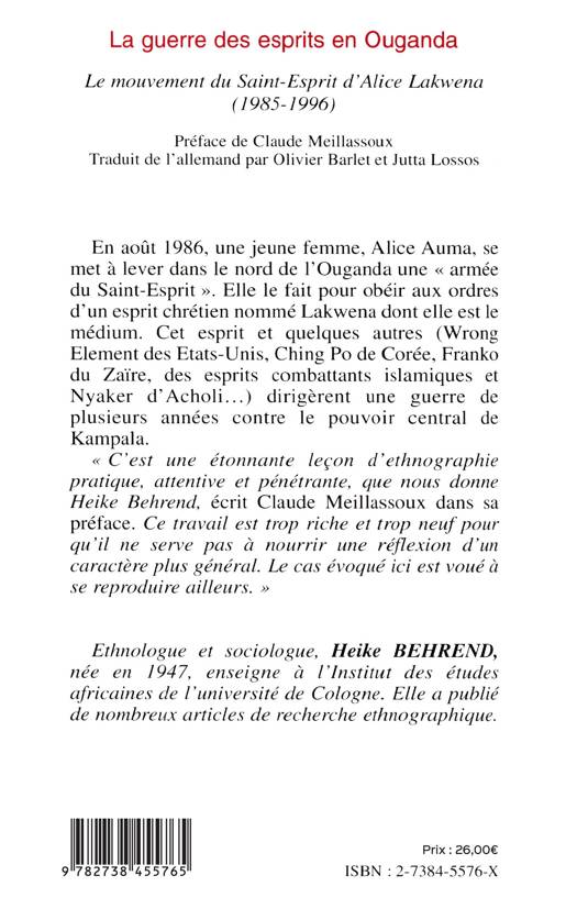 En août 1986, une jeune femme, Alice Auma, se met à lever dans le nord de l'Ouganda une « armée du Saint-Esprit». Elle le fait pour obéir aux ordres d'un esprit chrétien nommé Lakwena dont elle est le médium. Cet esprit et quelques autres (Wrong Element des Etats-Unis, Ching Po de Corée, Franko du Zaïre, des esprits combattants islamiques et Nyaker d' Acholi ... ) dirigèrent une guerre de plusieurs années contre le pouvoir central de Kampala.