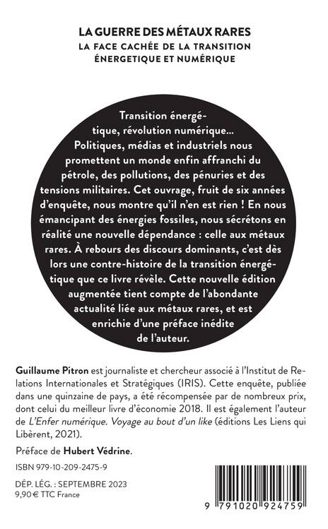 Transition énergétique, révolution numérique...Politiques, médias et industriels nous promettent un monde enfin affranchi du pétrole, des pollutions, des pénuries et des tensions militaires. Cet ouvrage, fruit de six années d'enquête, nous montre qu'il n'en est rien ! En nous émancipant des énergies fossiles, nous sécrétons en réalité une nouvelle dépendance : celle aux métaux rares. À rebours des discours dominants, c'est dès lors une contre-histoire de la transition énergétique que ce livre révèle. Cette nouvelle édition augmentée tient compte de l'abondante actualité liée aux métaux rares, et est enrichie d'une préface inédite de l'auteur.