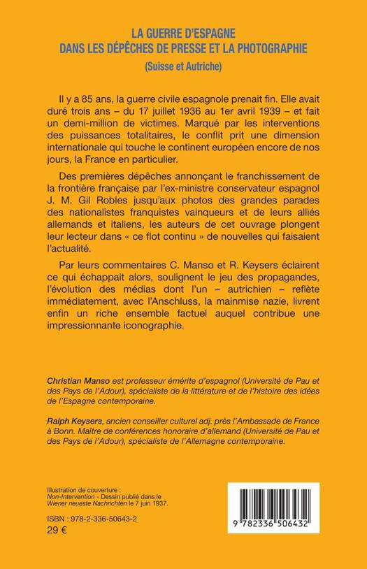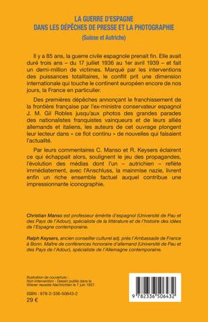 Il y a 85 ans, la guerre civile espagnole prenait fin. Elle avait duré trois ans - du 17 juillet 1936 au 1er avril 1939 - et fait un demi-million de victimes. Marqué par les interventions des puissances totalitaires, le conflit prit une dimension internationale qui touche le continent européen encore de nos jours, la France en particulier. Des premières dépêches annonçant le franchissement de la frontière française par l'ex-ministre conservateur espagnol J. M. Gil Robles jusqu'aux photos des grandes parades des nationalistes franquistes vainqueurs et de leurs alliés allemands et italiens, les auteurs de cet ouvrage plongent leur lecteur dans ce flot continu de nouvelles qui faisaient l'actualité. Par leurs commentaires C. Manso et R. Keysers éclairent ce qui échappait alors, soulignent le jeu des propagandes, l'évolution des médias dont l'un - autrichien - reflète immédiatement, avec l'Anschluss, la mainmise nazie, livrent enfin un riche ensemble factuel auquel contribue une impressionnante iconographie.