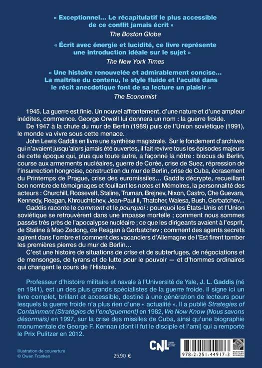 1945. La guerre est finie. Un nouvel affrontement, d'une nature et d'une ampleur inedites, commence. George Orwell lui donnera un nom: la guerre froide. De 1947 a la chute du mur de Berlin (1989) puis de l'Union sovietique (1991), le monde va vivre sous cette menace. John Lewis Gaddis en livre une synthese magistrale. Sur le fondement d'archives qui n'avaient jusqu'alors jamais ete ouvertes, il fait revivre tous les episodes majeurs de cette epoque qui, plus que toute autre, a faconne la notre: blocus de Berlin, course aux armements nucleaires, guerre de Coree, crise de Suez, repression de l'insurrection hongroise, construction du mur de Berlin, crise de Cuba, ecrasement du Printemps de Prague, crise des euromissiles... Gaddis decrypte, recueillant bon nombre de temoignages et fouillant les notes et Memoires, la personnalite des acteurs: Churchill, Roosevelt, Staline, Truman, Brejnev, Nixon, Castro, Che Guevara, Kennedy, Reagan, Khrouchtchev, Jean-Paul II, Thatcher, Walesa, Bush, Gorbatchev... Gaddis raconte le comment et le pourquoi pourquoi les Etats-Unis et l'Union sovietique se retrouverent dans une impasse mortelle; comment nous sommes passes tres pres de l'apocalypse nucleaire; ce que les dirigeants avaient a l'esprit, de Staline a Mao Zedong, de Reagan a Gorbatchev; comment des agents secrets agirent dans l'ombre et comment des vacanciers d'Allemagne de l'Est firent tomber les premieres pierres du mur de Berlin... C'est une histoire de situations de crise et de subterfuges, de negociations et de mensonges, de tyrans et de lutte pour le pouvoir - et d'hommes ordinaires qui changent le cours de l'Histoire.