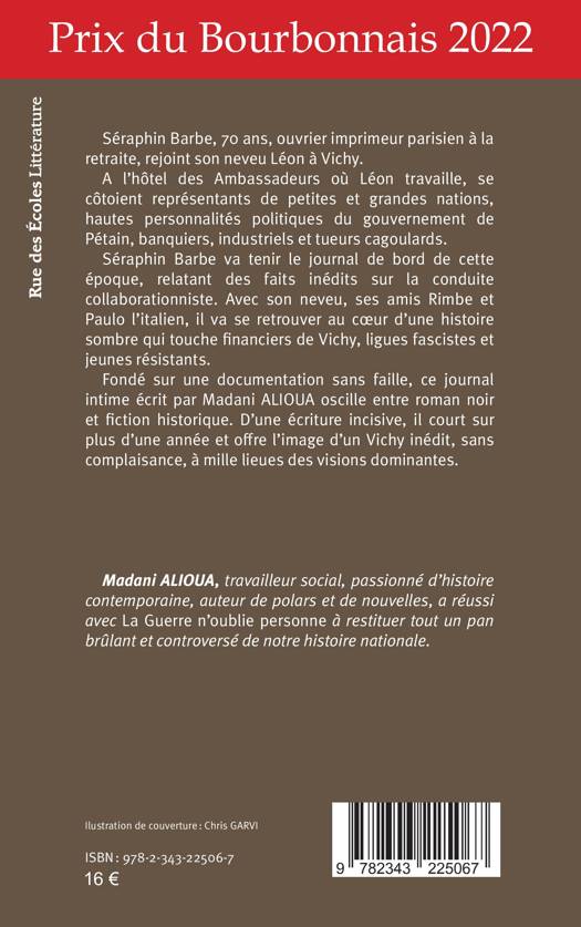 Séraphin Barbe, 70 ans, ouvrier imprimeur parisien à la retraite, rejoint son neveu Léon à Vichy. A l’hôtel des Ambassadeurs où Léon travaille, se côtoient représentants de petites et grandes nations, hautes personnalités politiques du gouvernement de Pétain, banquiers, industriels et tueurs cagoulards. Séraphin Barbe va tenir le journal de bord de cette époque, relatant des faits inédits sur la conduite collaborationniste. Avec son neveu, ses amis Rimbe et Paulo l’italien, il va se retrouver au cœur d’une histoire sombre qui touche financiers de Vichy, ligues fascistes et jeunes résistants. Fondé sur une documentation sans faille, ce journal intime écrit par Madani ALIOUA oscille entre roman noir et fiction historique. D’une écriture incisive, il court sur plus d’une année et offre l’image d’un Vichy inédit, sans complaisance, à mille lieues des visions dominantes.