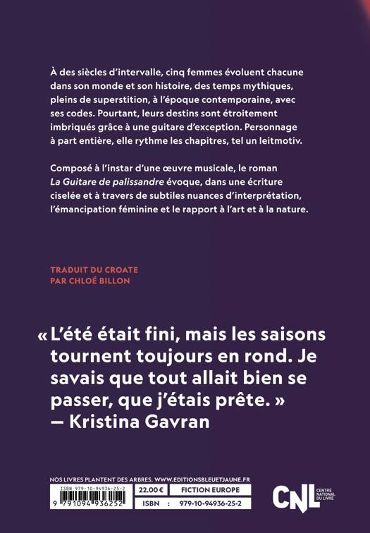 À des siècles d’intervalle, cinq femmes évoluent chacune dans son monde et son histoire, des temps mythiques, pleins de superstition, à l’époque contemporaine, avec ses codes. Pourtant, leurs destins sont étroitement imbriqués grâce à une guitare d’exception. Personnage à part entière, elle rythme les chapitres, tel un leitmotiv.<br /><br /> Composé à l’instar d’une oeuvre musicale, le roman La Guitare de palissandre évoque, dans une écriture ciselée et à travers de subtiles nuances d’interprétation, l’émancipation féminine et le rapport à l’art et à la nature.<br /><br /> Finaliste du Prix de littérature de l’Union européenne 2020