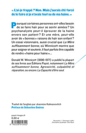 Pourquoi certaines personnes ont-elles besoin de se faire haïr pour se sentir aimées ? Un psychanalyste peut-il éprouver de la haine envers son patient ? Et une mère, peut-elle avoir de « bonnes » raisons de haïr son enfant ? Un essai visionnaire, aussi crucial que «La Mère suffisamment bonne», où Winnicott montre que pour soigner et soutenir, il faut parfois être capable de rendre « haine pour haine »...