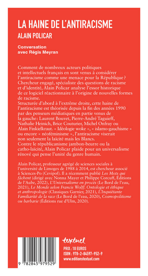 Comment en est on arrivé à haïr l'antiracisme ? Alain Policar analyse et dénonce comment de nombreux universitaires et penseurs français en sont venus à considérer l'antiracisme comme une menace pour la République. Comment des intellectuels médiatiques, souvent issus de la gauche, ont rejoint les néo-conservateurs ou les nationaux-républicains aux côtés de l'extrême droite pour affirmer que l'antiracisme viserait non seulement la laïcité mais les blancs! Alain Policar plaide ici pour un universalisme rénové qui pense l'unité du genre humain. Contre le républicanisme jambon-beurre ou la catho-laïcité, l'antiracisme doit se débarrasser du nationalisme et de sa formule moderne, le souverainisme, condition pour une véritable efficacité politique du combat contre le racisme.
