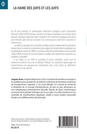 Au fil des années, le philosophe allemand d’origine juive Constantin Brunner (1862-1937) émerge comme une figure singulière à la croisée de la pensée classique (Spinoza, Kant, Hegel) et du monisme judaïque articulant une théorie spéculative unitaire à la connaissance des faits naturels et historiques. La mise en question de sa double condition juive et allemande le contraint à dresser une analyse de l’antisémitisme politique qui se développe à partir de 1880. Il y combat cette forme de résistance de la société civile à l’État de droit de tous les citoyens, quelles que soient leurs croyances ou traditions culturelles. Il en trace ici en 1919 la synthèse la plus complète, avant que le national-socialisme ne radicalise l’antisémitisme en programme d’exclusion des Juifs.