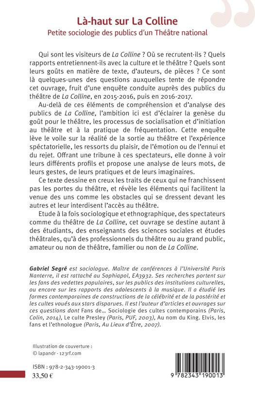 Qui sont les visiteurs de La Colline ? Où se recrutent-ils ? Quels rapports entretiennent-ils avec la culture et le théâtre ? Quels sont leurs goûts en matière de texte, d'auteurs, de pièces ? Ce sont là quelques-unes des questions auxquelles tente de répondre cet ouvrage, fruit d'une enquête conduite auprès des publics du théâtre de La Colline, en 2015-2016, puis en 2016-2017. Au-delà de ces éléments de compréhension et d'analyse des publics de La Colline, l'ambition ici est d'éclairer la genèse du goût pour le théâtre, les processus de socialisation et d'initiation au théâtre et à la pratique de fréquentation. Cette enquête lève le voile sur la réalité de la sortie au théâtre et l'expérience spéctatorielle, les ressorts du plaisir, de l'émotion ou de l'ennui et du rejet.