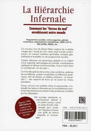 Ce nouveau livre de Daniel Robin explore les multiples visages des « forces du mal » dans notre monde contemporain, en croisant traditions spirituelles, analyses géopolitiques et enquêtes sur les programmes occultes. L’auteur dénonce une dynamique globale où se mêlent crime organisé, technologies de contrôle, manipulations politiques et dérives transhumanistes, le tout inscrit dans un contexte de « fin de cycle ». Ce livre décrypte les liens entre crises sanitaires, systèmes de surveillance, projets mondialistes et références ésotériques, afin de dresser un tableau cohérent – et inquiétant ! – des rapports de force qui se jouent au niveau planétaire. Conçu comme une synthèse claire et argumentée, il interpelle les lecteurs intéressés par la compréhension profonde des événements actuels et des puissances invisibles qui les influencent. Cet ouvrage représente un avertissement destiné à un public curieux, averti, et avide d’outils intellectuels pour analyser l’époque à travers une grille de lecture originale et transversale.