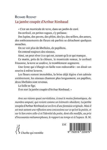 Écrit entre 1989 et 1996, « la Jambe coupée d’Arthur Rimbaud » avait paru en trois livraisons dans la revue « Diérèse ». Le voici pour la première fois publié en volume. Dans ce long poème en prose, Richard Rognet pose la question de l’identité, relativement à l’espace et au temps. Mais, si l’espace est trop vaste, le temps infranchissable, le poète cherche comme Rimbaud, à se « guérir du passé comme de l’avenir ». Le temps, c’est « l’instant ». C'est là que se construit une identité. Comme le souligne Béatrice Marchal dans sa présentation, « avec ses visions quasi surréalistes, à tout le moins fantastiques, du membre amputé, qui revient comme un leitmotiv obsédant, "la Jambe coupée d’Arthur Rimbaud" est un livre d’une fantaisie originale. Mais il est tout autant une réflexion sans concessions sur ce qu’est la poésie, et sur le lien entre celle-ci et l’identité du poète, dont elle modifie, au prix d’incessantes métamorphoses, le rapport au temps et à l'espace. »